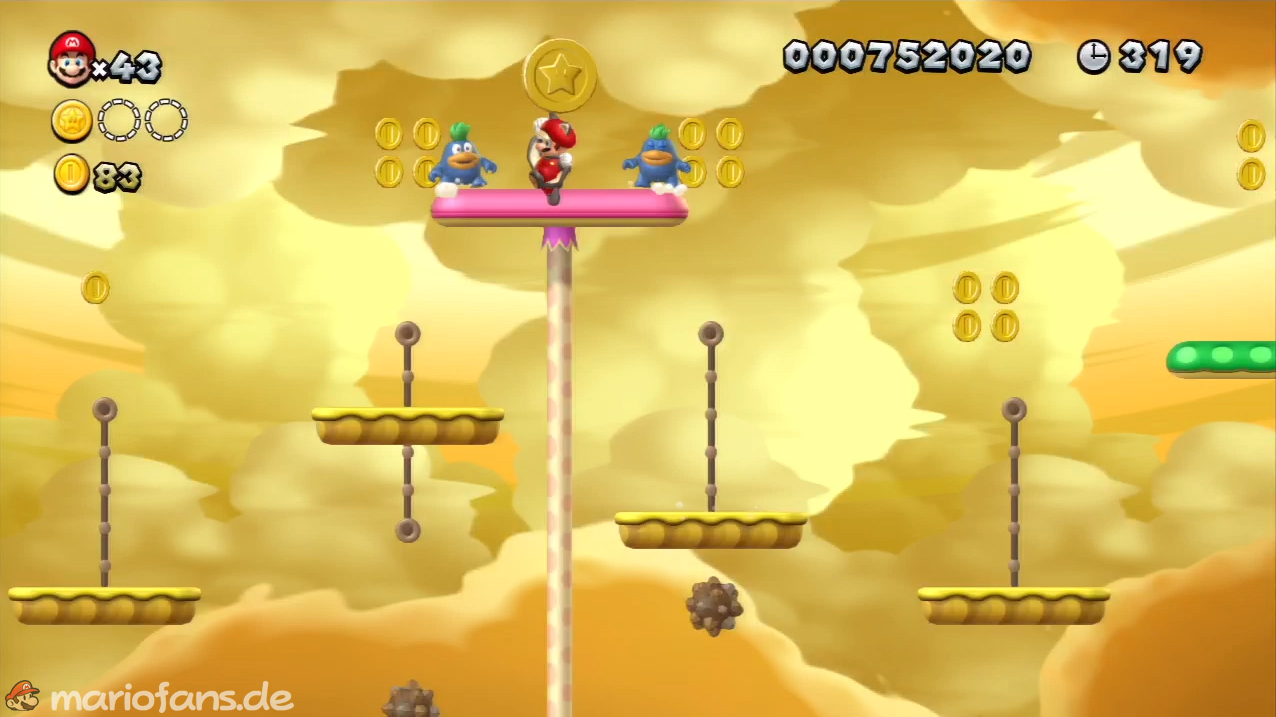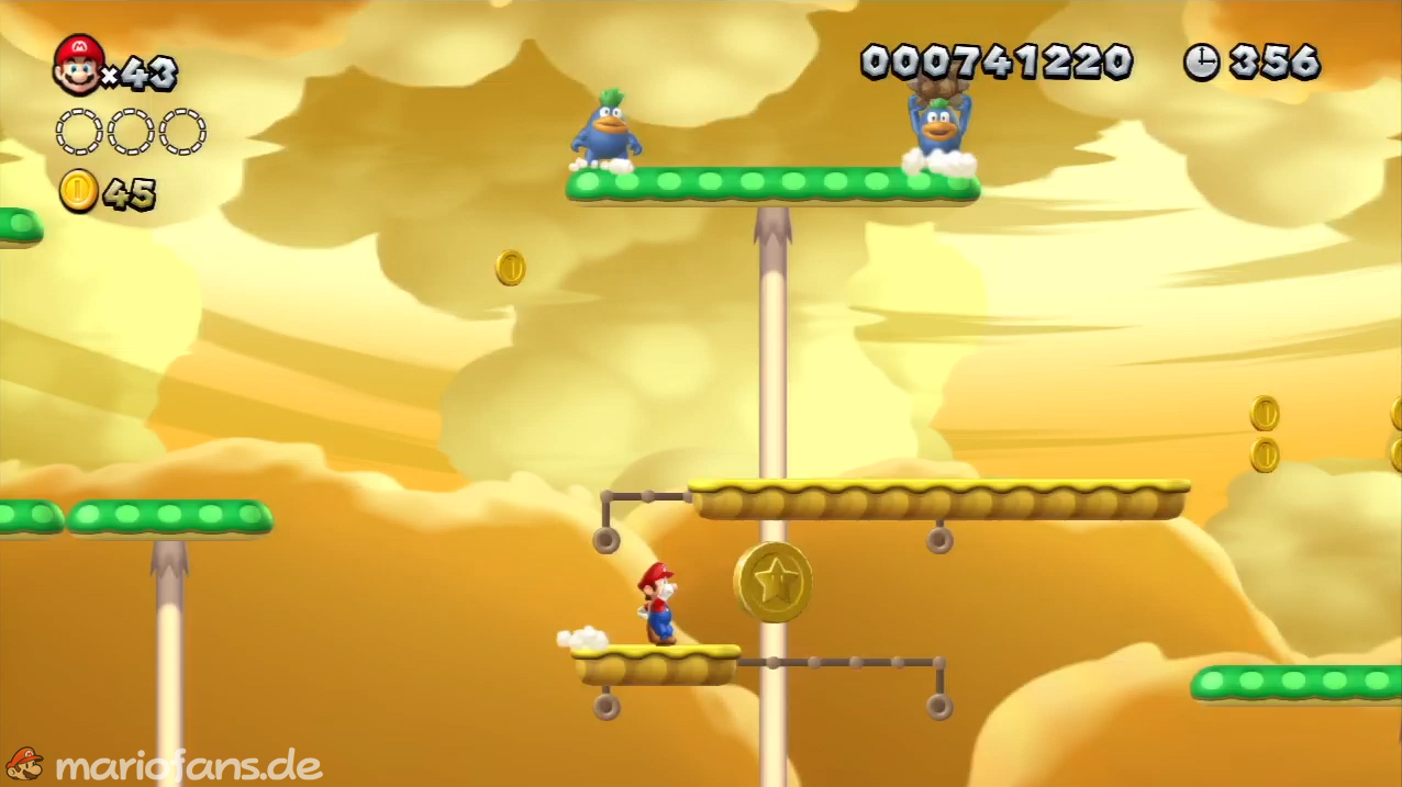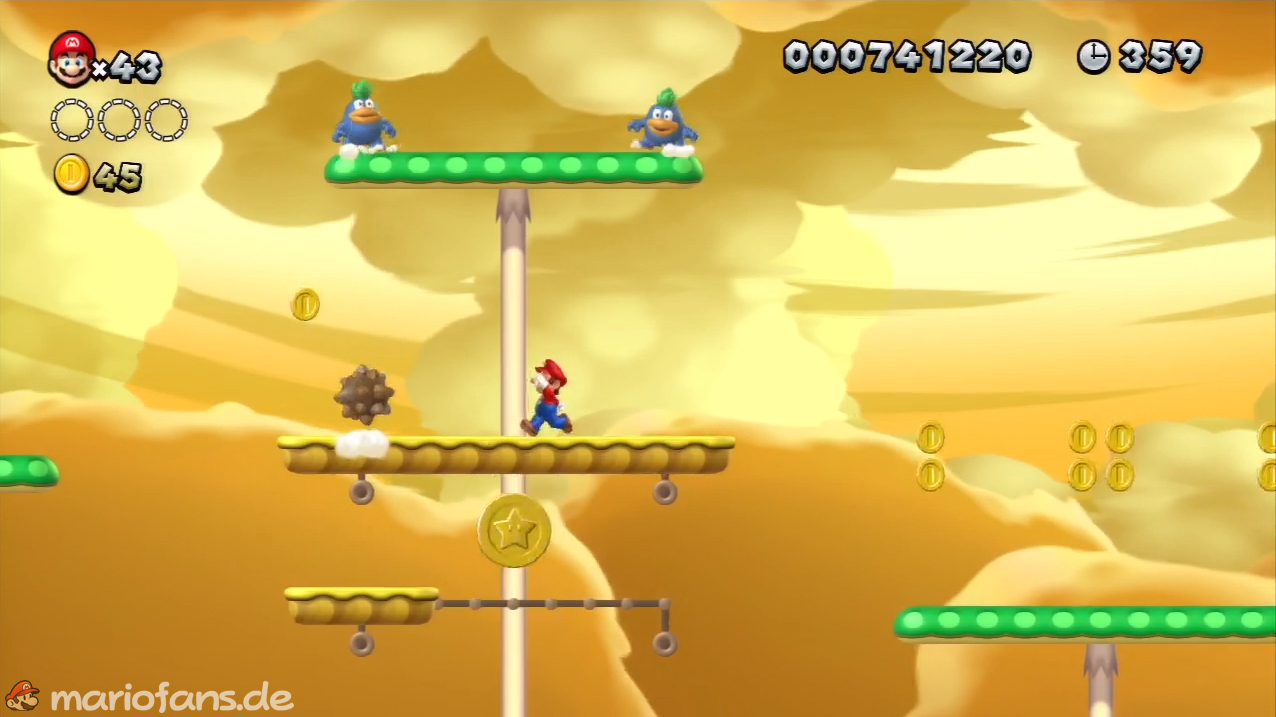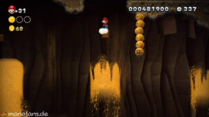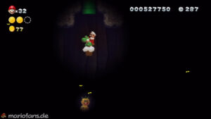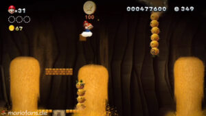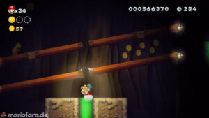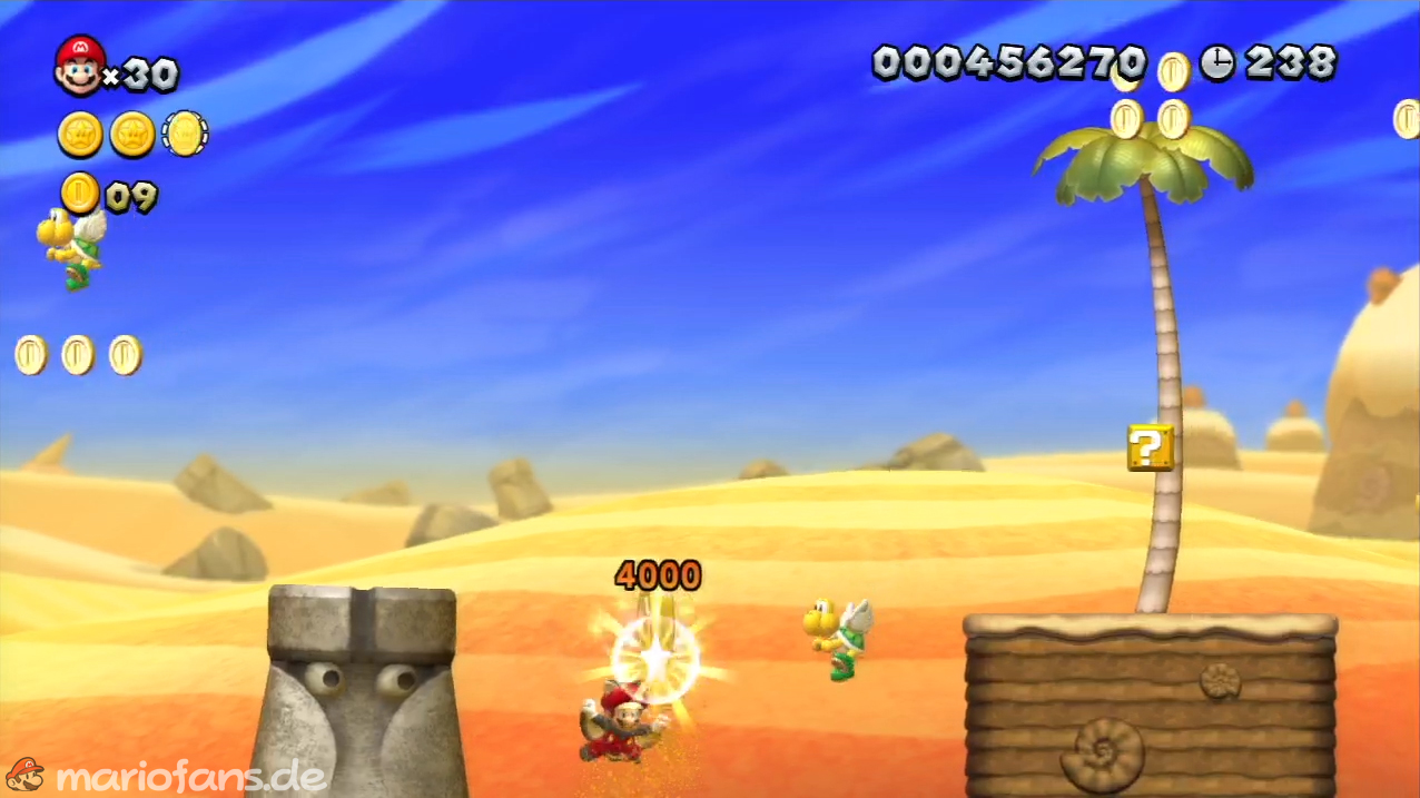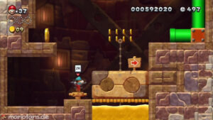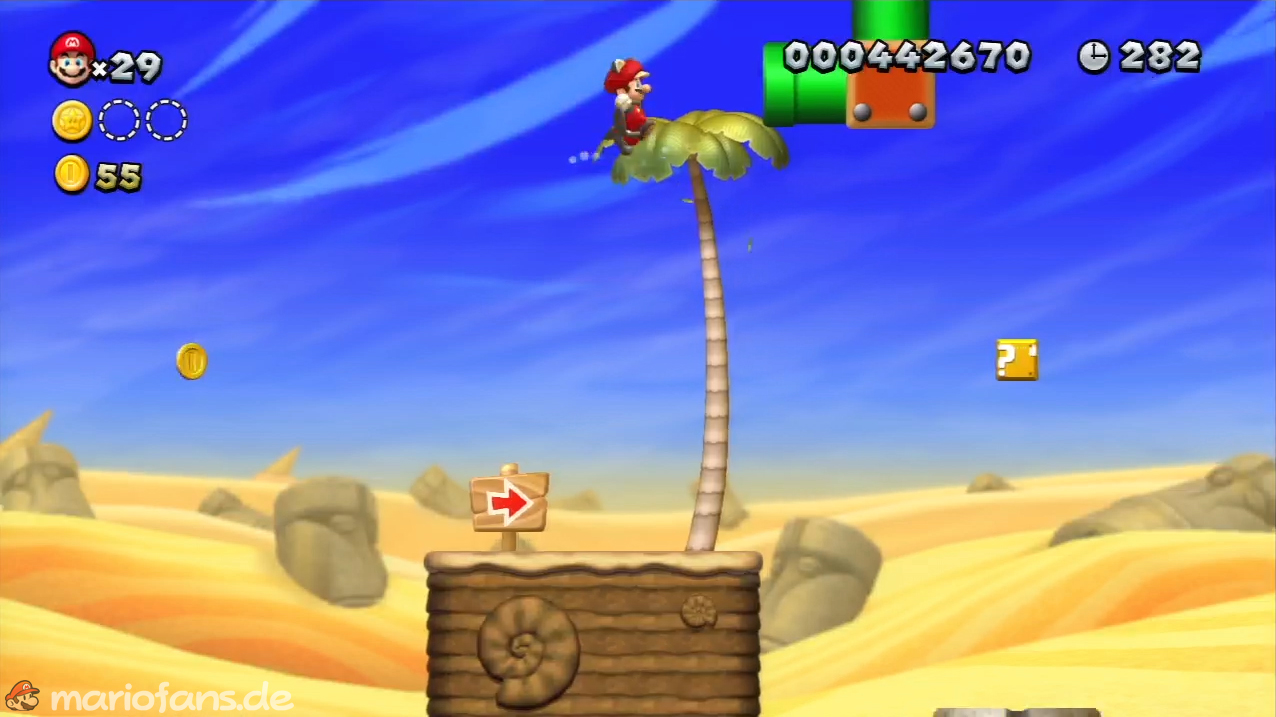 - Star Coin 2: Use the Super Acorn to fly up the palm tree after the checkpoint. Enter the pipe and activate the P-Switch.
