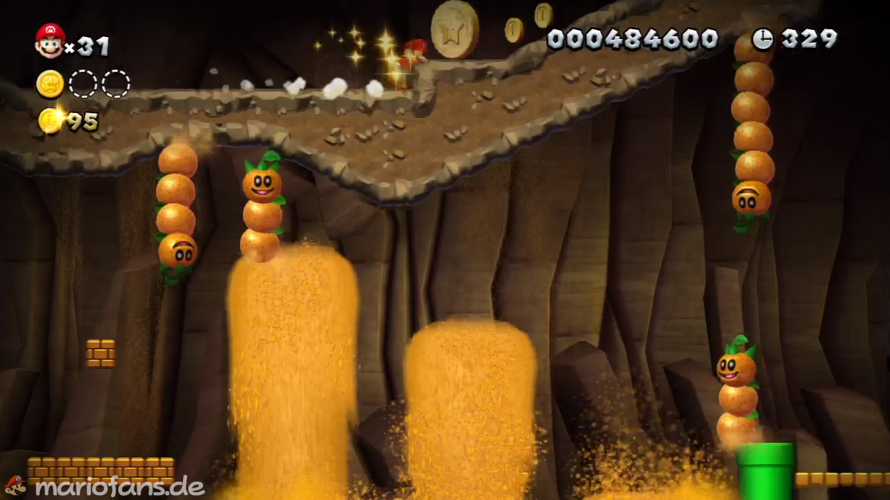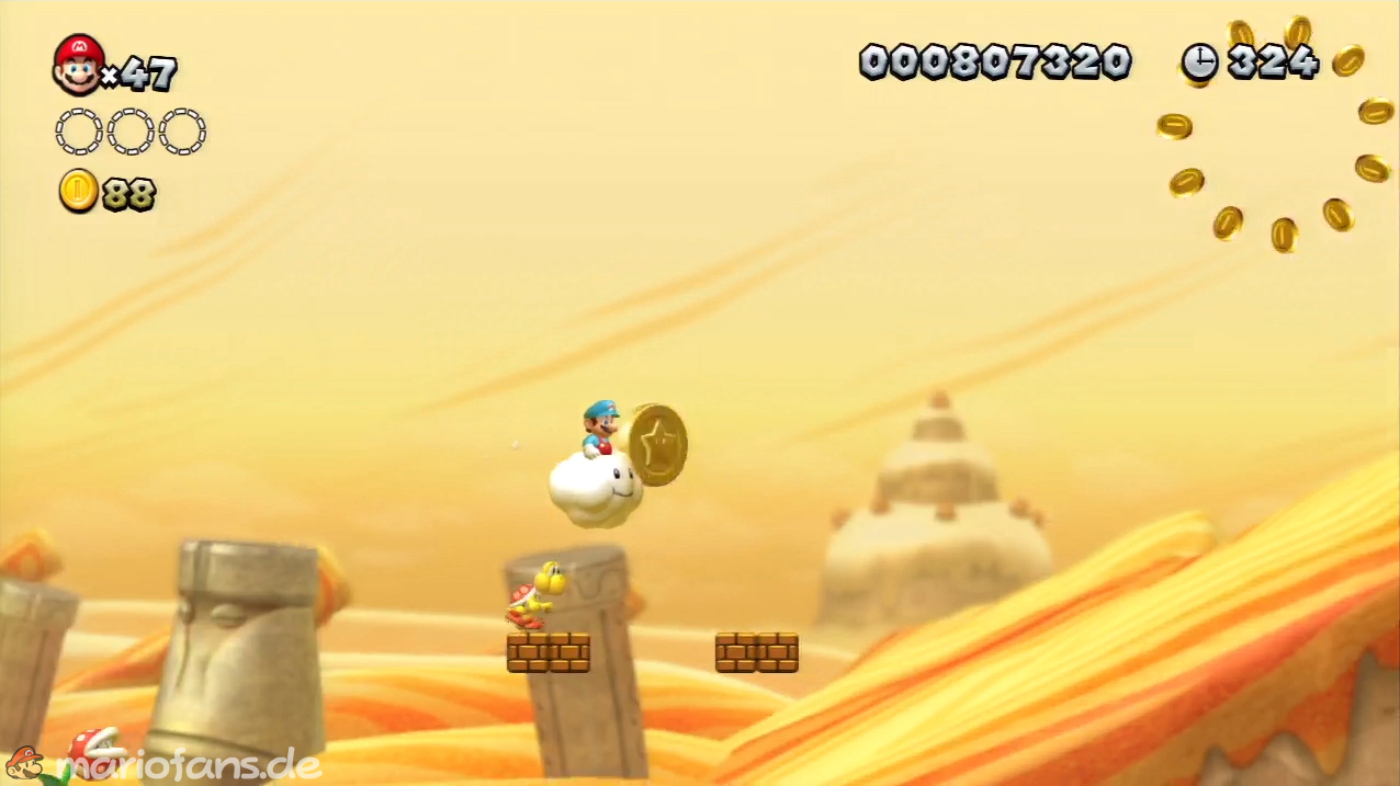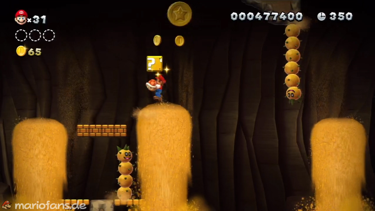 - Star Coin 3: Harder to reach. Either ride the sand geyser, throw a Koopa shell, or use Pink Baby Yoshi to float safely.